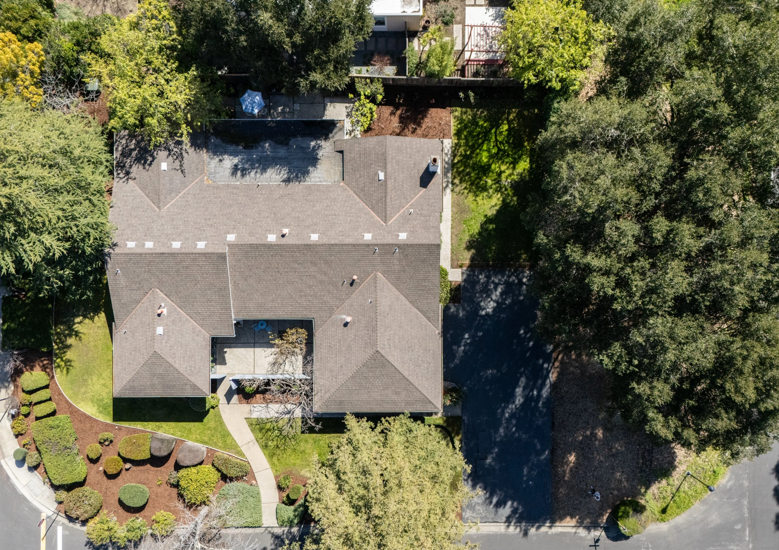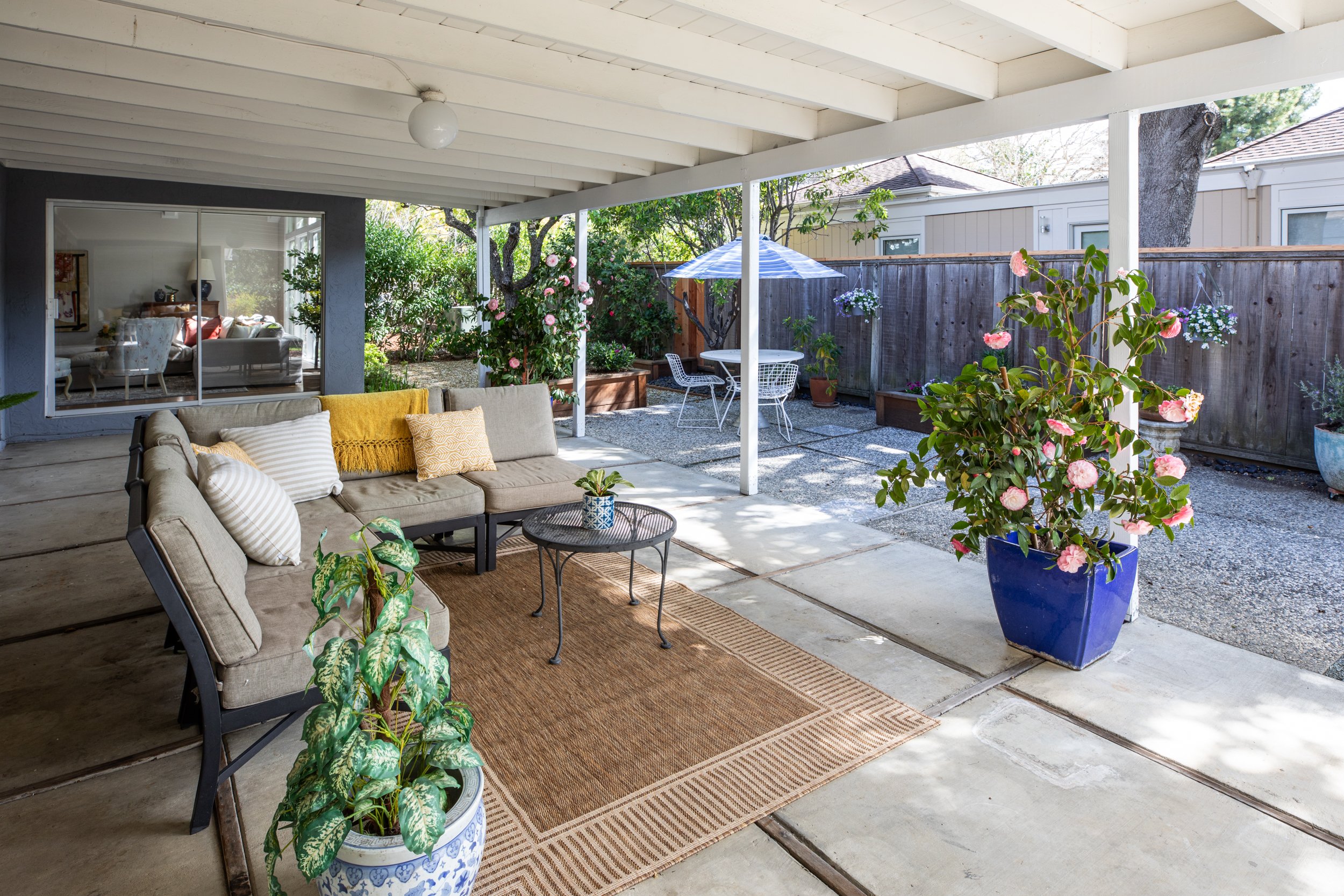 Along with 4 well-sized bedrooms, the house affords a highly functional floor plan with a den/ office accessed near the front entry, as well as ample built-in storage and closets. The dining room opens into the living room via gorgeous trellis doors that can be slid open or closed. The family room, located adjacent to the kitchen and breakfast room, includes a painted brick fireplace with raised hearth, and a perfectly situated wall and counter area for an entertainment center. The large covered patio with adjacent landscaping provides an additional area for gatherings of family and friends.